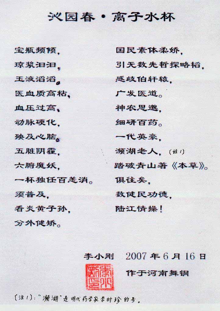 -----我是從事建筑的高工,本來沒有資格去攻克醫(yī)學(xué)難題,卻為了自身健康才扣響醫(yī)學(xué)的大門。由于我1990年患高血壓,因怕中風(fēng)才研究發(fā)明了離子水瓶,我把水處理成微小分子團(tuán)水,飲用后治愈了高血壓。便于1993年底送到三家省級醫(yī)院做臨床試用4個月。經(jīng)北京和廣西醫(yī)學(xué)專家鑒定:"降脂降壓效果好"," 能擴大心腦動脈流量,改善心腦電圖以及微循環(huán)","對治療心腦動脈粥樣硬化、高血壓、高血脂有良好的醫(yī)療保健作用。""產(chǎn)品的技術(shù)性能和療效達(dá)到了同類產(chǎn)品的國內(nèi)領(lǐng)先水平,經(jīng)廣西醫(yī)學(xué)科學(xué)情報研究所檢索,未見國外有類似報道。"中國醫(yī)學(xué)科學(xué)院張正國教授從美國國立醫(yī)學(xué)圖書館數(shù)據(jù)庫存Medline檢索英俄文資料,均未見類似報告。2000年上市后,我為了對消費者負(fù)責(zé)而繼續(xù)觀察研究,一直通過《信譽卡》和《質(zhì)量跟蹤調(diào)查書》向患者承諾療效,請用戶使用6個月后反饋效果。和脂壓患者飲用2至5個月內(nèi),消除癥狀,停服藥物,血壓正常;冠心病患者飲用3~5個月逐漸減輕至消除心絞痛、房顫等癥狀,不再服藥,飲用1年左右心電圖正常,經(jīng)冠脈造影掃描無明顯狹窄,表明冠心病痊愈。大量患者還反映許多衰弱器官被修復(fù),讓前列腺增生、慢性咽喉炎、慢性氣管炎、支氣管炎、慢性胃炎、腸炎和膽囊炎等不藥而愈;2型糖尿病患者是因為胰島衰弱致病,飲用該水半年至一年,逐漸減藥至停藥,血糖尿糖正常,真正治愈2型糖尿病。中風(fēng)后遺癥患者飲用六七個月,可逐漸減輕至消除肢體和語言障礙,表明飲用該水能讓壽命很長的神經(jīng)元細(xì)胞逐漸修復(fù),奇跡般地恢復(fù)肢體和語言功能。飲用后還使胸腺和脾臟兩個重要的免疫器官被修復(fù)和增強,產(chǎn)生免疫細(xì)胞多,提高了免疫力,使人不生病或少生病。自此, 飲用微小分子團(tuán)水創(chuàng)造了攻克冠心病、高(低)血壓和糖尿病三大醫(yī)學(xué)難題的奇跡。人們對此感到不可思議,但實踐是檢驗真理的唯一標(biāo)準(zhǔn)。